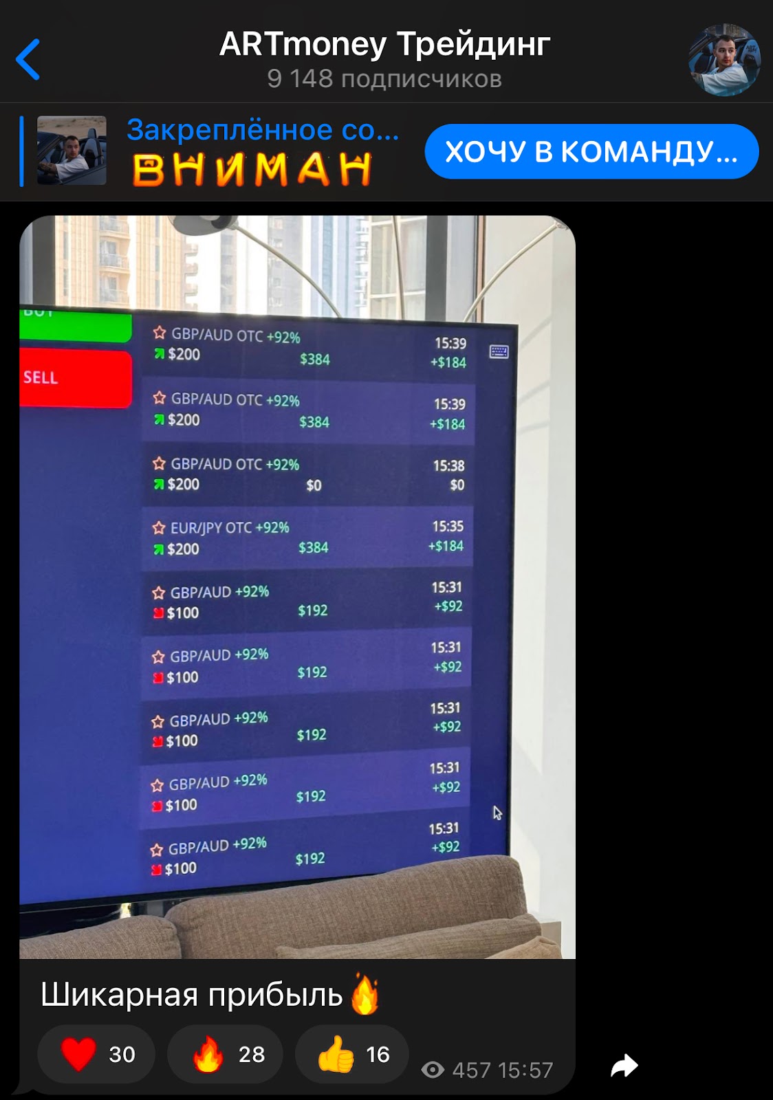 В телеграмм-канале Art Money выкладывает графики прибыли, представляет анонсы к прямым эфирам.