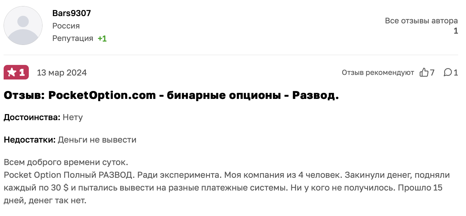 В отзывах говорят, что платформа Pocket Option тоже не выводит средства. Пользователи уходят в минус при использовании биржи.