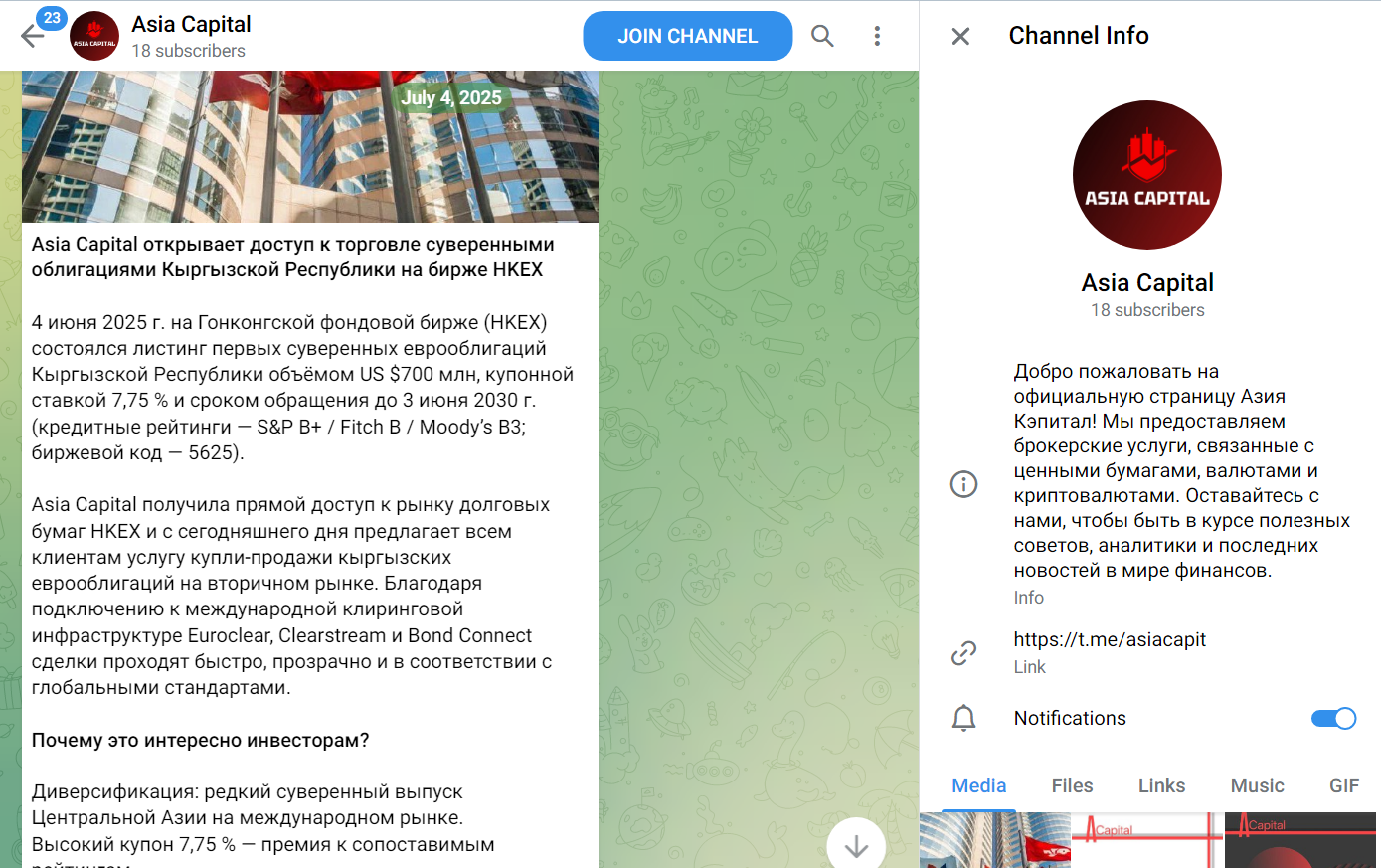Телеграмм канал Asia Capital функционирует с июня 2023 года, и на него подписано 18 человек.