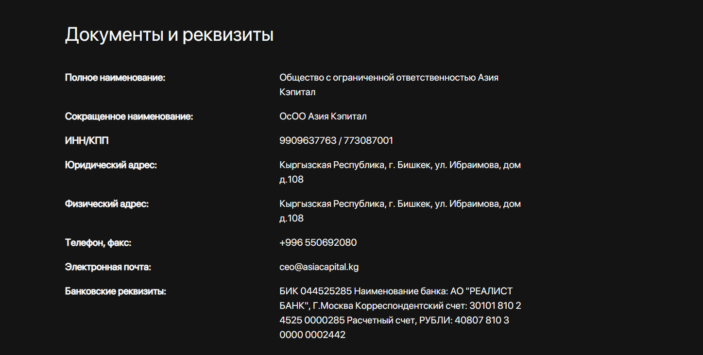 Asia Capital работает с необходимыми лицензиями, и у компании есть регистрация в Бишкеке. Признаков мошенничества у проекта нет, однако основатели не делятся верифицированными отчетами по выплатам клиентам за инвестирование, и из других сведений мы выделили: