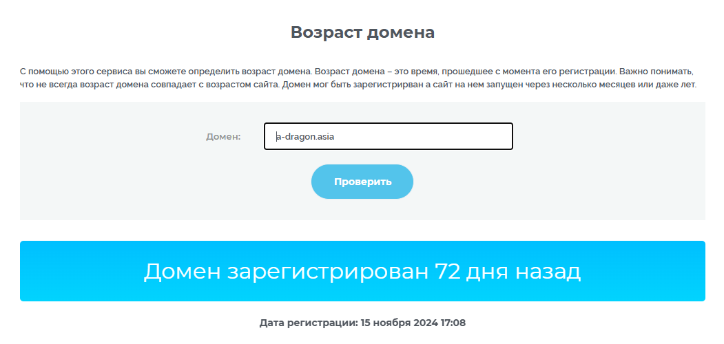 Данная информация вызывает сомнения, поскольку проверка возраста домена сайта показывает, что создан он был совсем недавно – 72 дня назад.
