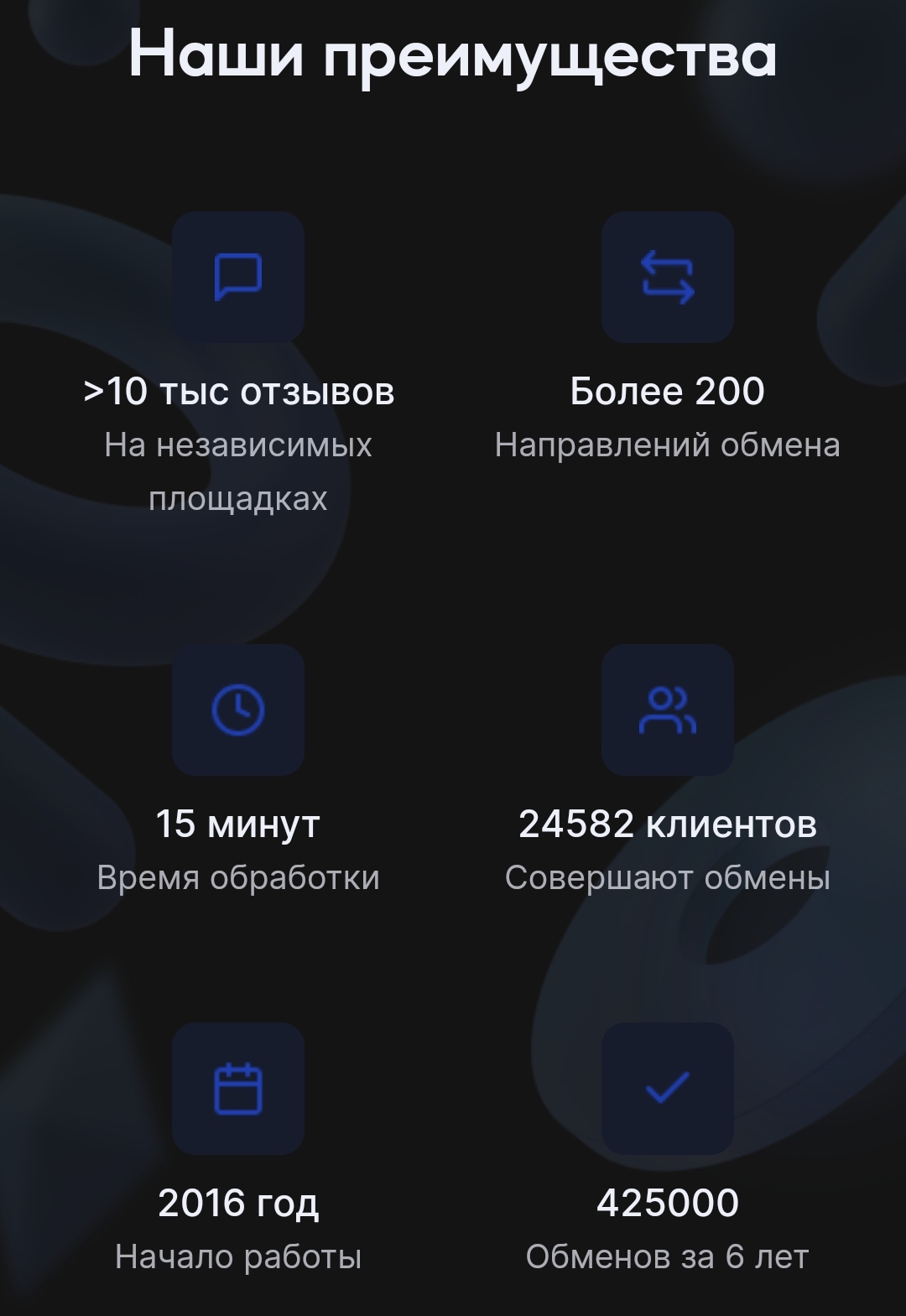 На сайте организации можно ознакомиться с преимуществами из статистических данных. К ним относятся многочисленные отзывы на независимых площадках, более 200 направлений обмена. Почти 25 000 клиентов совершили обмен на площадке, а время обработки транзакций составляет около 15 минут. Организация начала работу в 2016 году и за 6 лет из 9 помогла совершить 425 000 транзакций.