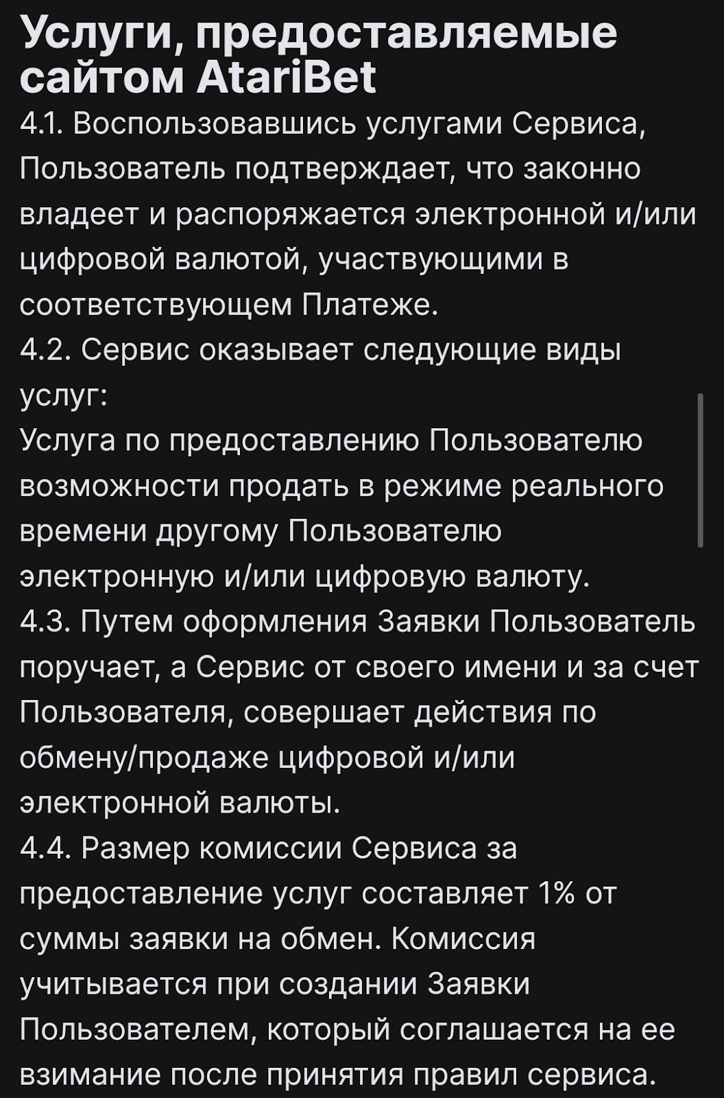В разделе «Правила сайта» есть пункт, указывающий полномочия обменника. Здесь мы узнали, что комиссия от суммы заявки на обмен равна 1%. Обменник предлагает только одну услуг – продажу в реальном времени электронных и цифровых валют. При этом администрация не обладает полномочием отменить и совершить возврат средств по подозрительной заявке, что может как принести пользу, так и вред клиентам, но данный метод помогает бороться с мошенниками.