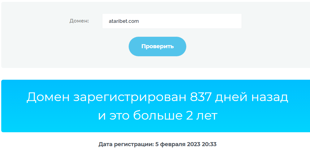 Регистрация домена сайта «Атарибет» прошла более 2 лет назад на 23 мая 2025 года. Данные о том, что дата появления хоста – 5 февраля 2023 года опровергают информацию, указанную о его регистрации на сайте. Кроме того, проект зарегистрирован на IP-адрес Литвы.