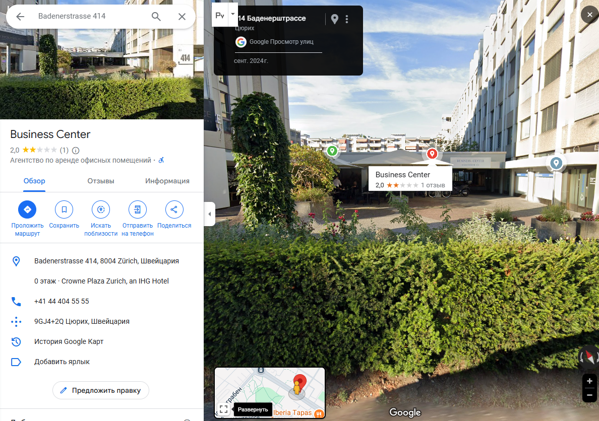 Да, Aathegen — вроде реальная компания, «головной офис» которой находится по адресу Баденерштрассе 414, 8004 Цюрих, Швейцария. Но если не полениться и пробить этот адрес, окажется, что там нет никакой «Брокерской компании». Из чего-то максимально приближенного по смыслу там есть лишь маленький бизнес-центр, а скорее даже коворкинг. Именно и пьют кофе сотрудники «компании».