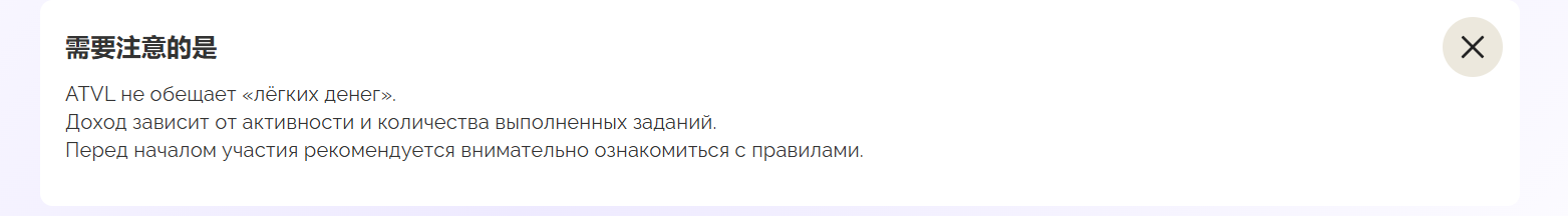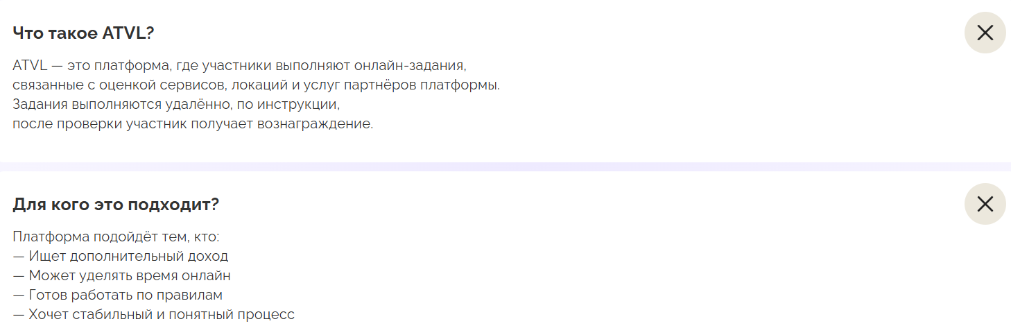 На основном сайте платформы не указывается, сколько именно стоит оплата за выполнение одного задания и какой заработок на Atvl участник сможет стабильно получать. На платформе доступно более 10 типов заданий, но какие именно это задания, кроме написания отзывов на заказ, не говорится.