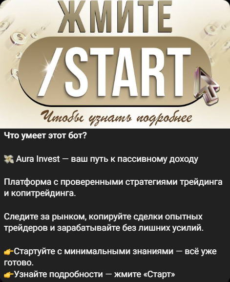 Сам бот позиционируется как платформа с проверенными стратегиями трейдинга и копитрейдинга. Админ предлагает следить за рынком, копировать сделки опытных трейдеров и зарабатывать без лишних усилий. При этом проект Aura Invest не предъявляет каких-либо требований к начальному уровню знаний инвестиций.