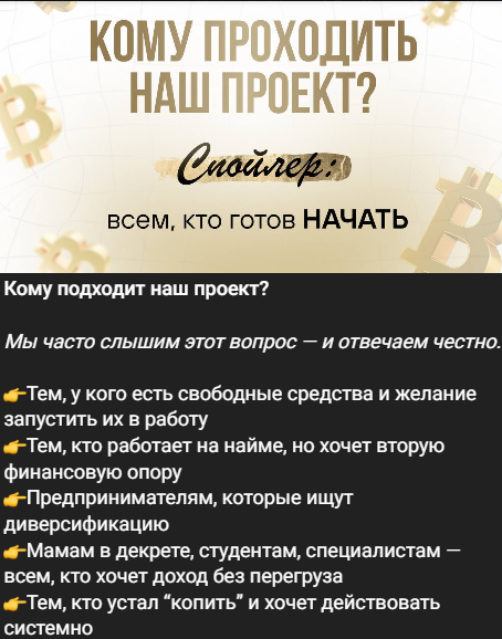 После запуска бота приходит видеообращение от автора. Анна убеждает потенциальных клиентов, что зарабатывать можно без стресса и риска, в абсолютном спокойствии и уверенности в результате. Инвестор называет это «пространством, которое работает на Вас». Анна обещает показать, как зарабатывать на криптовалюте через копитрейдинг даже при отсутствии опыта и лишнего времени. Админ Aura Invest перечисляет, кому подходит проект: