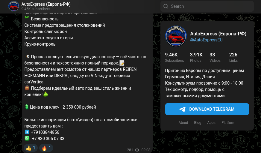 Проект «AutoExpress (Европа-РФ)» – это Телеграм-витрина услуг по «пригону авто под ключ» из Европы, по крайней мере так заявляет команда канала. Авторы делают акцент на Германию, Италию и Данию, обещают технический осмотр, помощь с документами и, конечно же, нереально низкие цены. В ленте регулярно выкладывают объявления с VIN-отчетами и контактами, включая российские номера. Похоже на живой автоподбор, но есть нюансы и серьезные подводные камни.