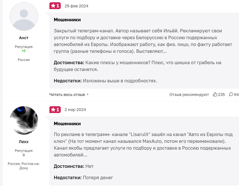 Как уже говорили в начале, отзывы о Телеграм-канале «Автоэкспресс» в основном нехорошие, в сети нет ни одного позитивного комментария. Нет постов и реальных историй, где клиенты показывают договоры, квитанции и полученные автомобили. Напротив, этот проект часто упоминают на форумах и в блогах по разоблачению скама и мошенничества.