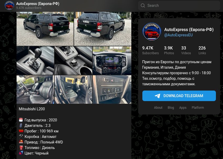 Канал в Телеграмм «AutoExpress (Европа-РФ)» отзывы получил сугубо негативные, в сети люди пишут об обмане и не советуют связываться с этим проектом. Между тем админы комьюнити предлагают довольно выгодные варианты сотрудничества и продолжают привлекать все новых подписчиков. Чтобы вы случайно не попались на этот развод, мы провели свой обзор и сейчас подробно обо всем расскажем.