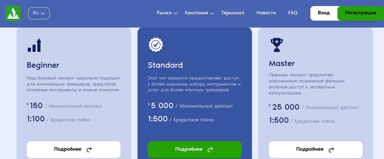 - Master. Вложения от 25 000 долларов. Торговать можно с плечом 1 к 500.
