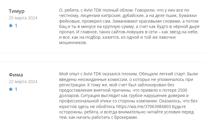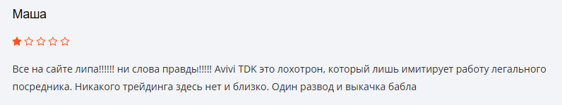 Большинство трейдеров плохо высказывается об Авиви ТДК. Пишут, что компания не выводит деньги, скрывает комиссии, блокирует счета. С отзывами от реальных пользователей avivitdk com можно ознакомиться ниже: