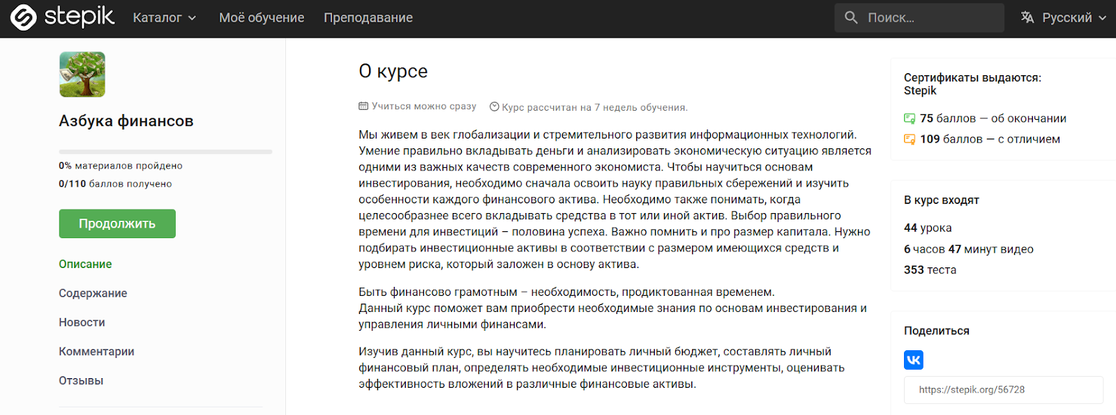 В материалы входят 44 урока и 353 теста, а чтобы получить сертификат, нужно набрать 75 баллов для обычного документа и 110 – с отличием.