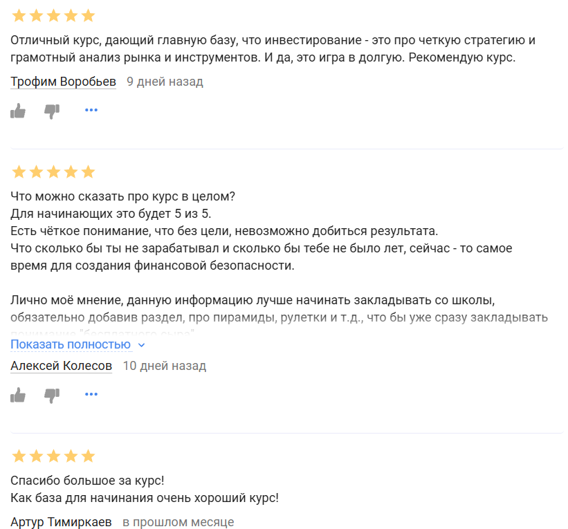 Пользователи оставили сотни отзывов о проекте, причем почти все они положительные, а ученики отмечают хорошую подачу и большое количество полезных знаний, которые они получили во время обучения. Отрицательных комментариев как таковых нет, а некоторые просто говорят, что в материалах базовая информация, которая может быть полезна новичкам, но не продвинутым инвесторам.