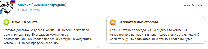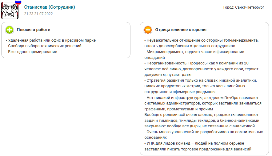 Исходя из отзыва Михаила мы решили рассмотреть ещё один подобный отзыв от сотрудника, уже Станислава. Он отмечает всего три плюса: красота места, где находится офис, премии и свободу решений. Минусов работы написано 7 штук: неуважение по отношению к нему, дисциплинарная строгость начальства, сомнительные причины увольнений, неорганизованность процессов.