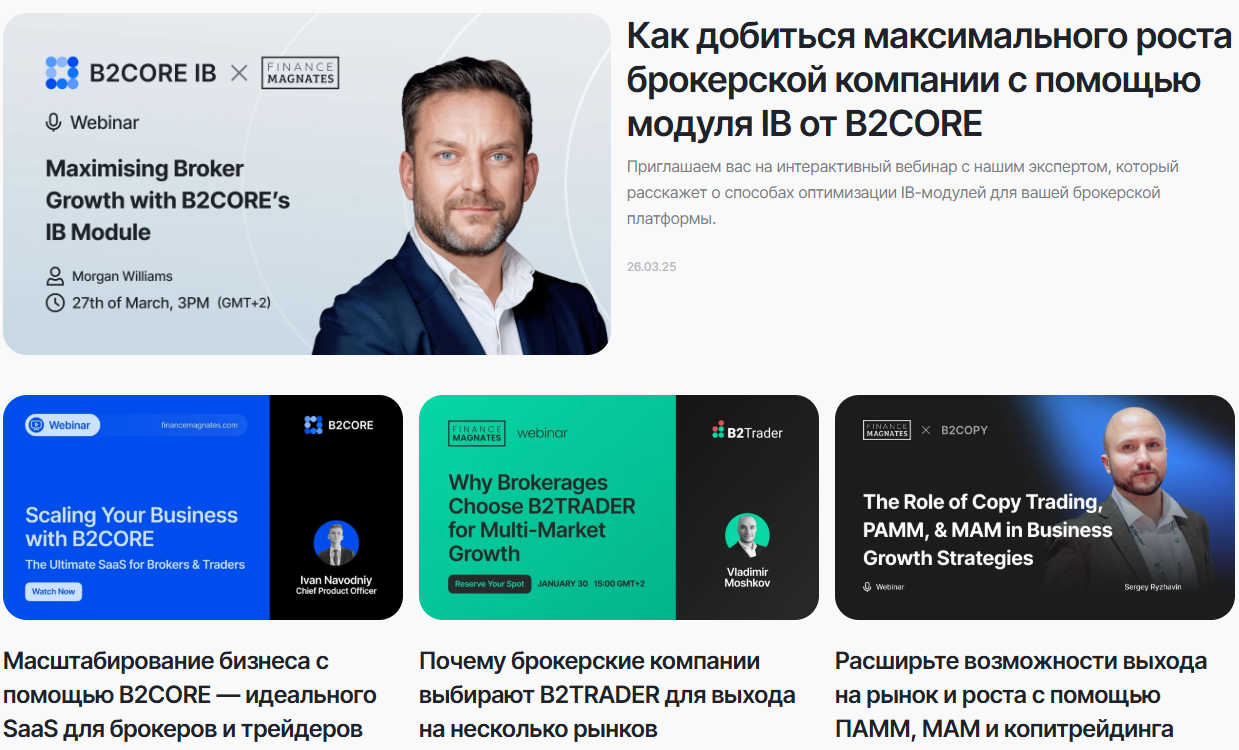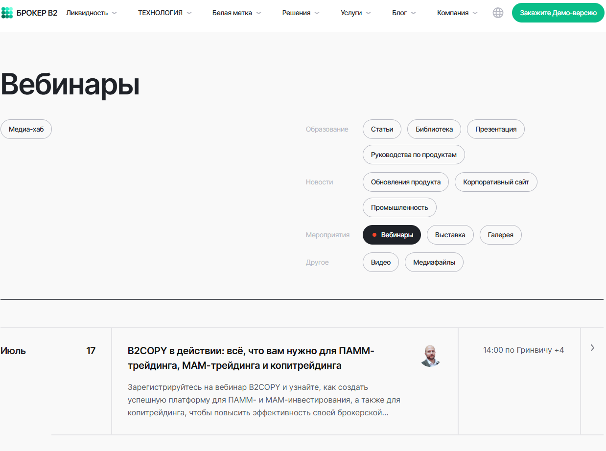 Среди тем вебинаров можно увидеть такие как: стартапы – запуск форекс с White Label, трейдинг – стратегии, использование MT4/5, технические вопросы – протоколы API и FIX.