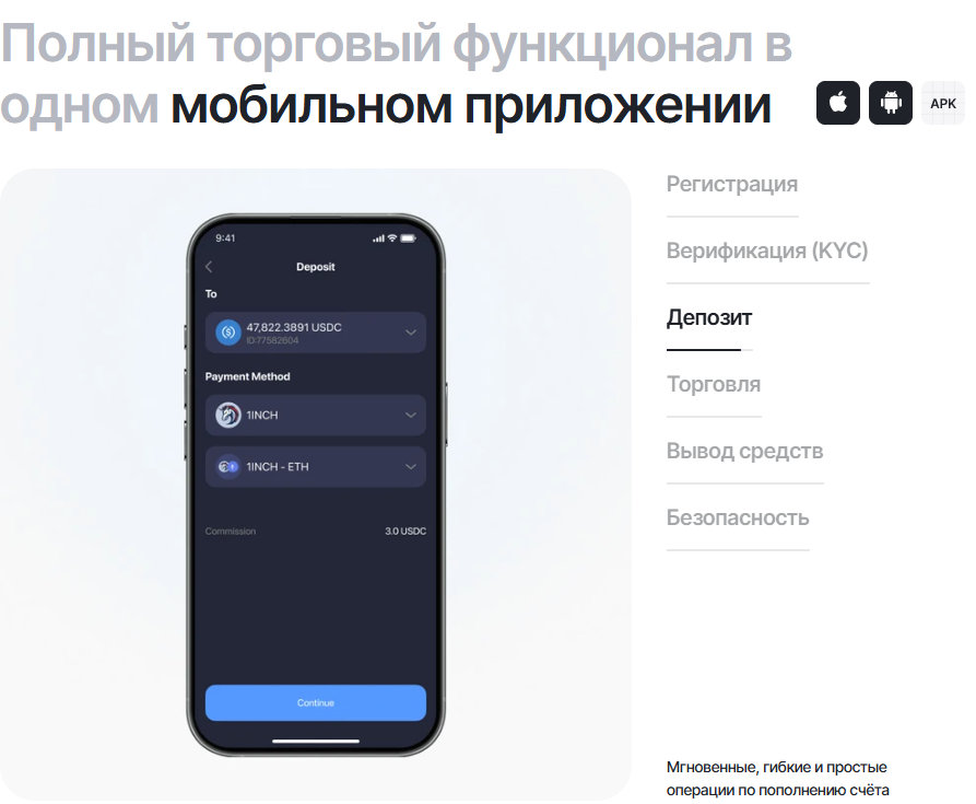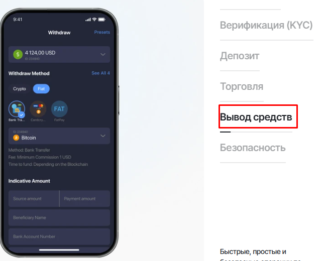 Также указана информация про то, как выводить средства, операции пополнения баланса счёта, а также безопасность и как начать торговать.