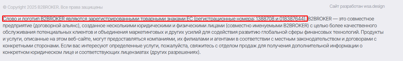 Слово B2Broker и логотип зарегистрированы в Евросоюзе, как товарные знаки под номерами 1388708 и 018387644. B2Broker представлен как совместное предприятие или договорной альянс, созданное несколькими юридическими и физическими лицами для улучшения обслуживания клиентов и развития финансовых технологий. Дата создания – 2014 год.