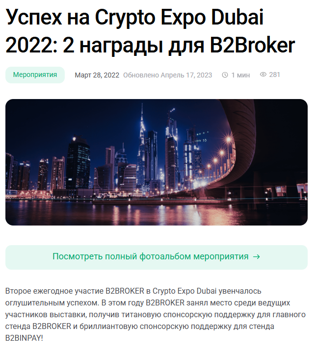 Среди них такие, как «Лучший провайдер ликвидности» и «Лучший провайдер криптоплатежей». Оба презента были получены на выставке Dubai Crypto Expo в 2022 году.