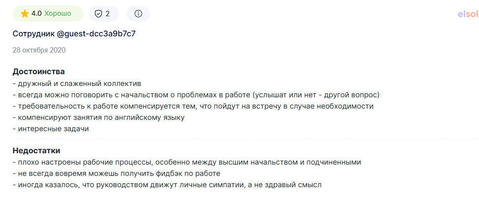 Ещё один отзыв, от неизвестного гостя. Он описывает слаженность коллектива, где всегда можно поговорить о проблемах с начальством, интересные задачи для развития опыта в разных сферах, дополнительные занятия по ИНО и фидбек, если сложно.