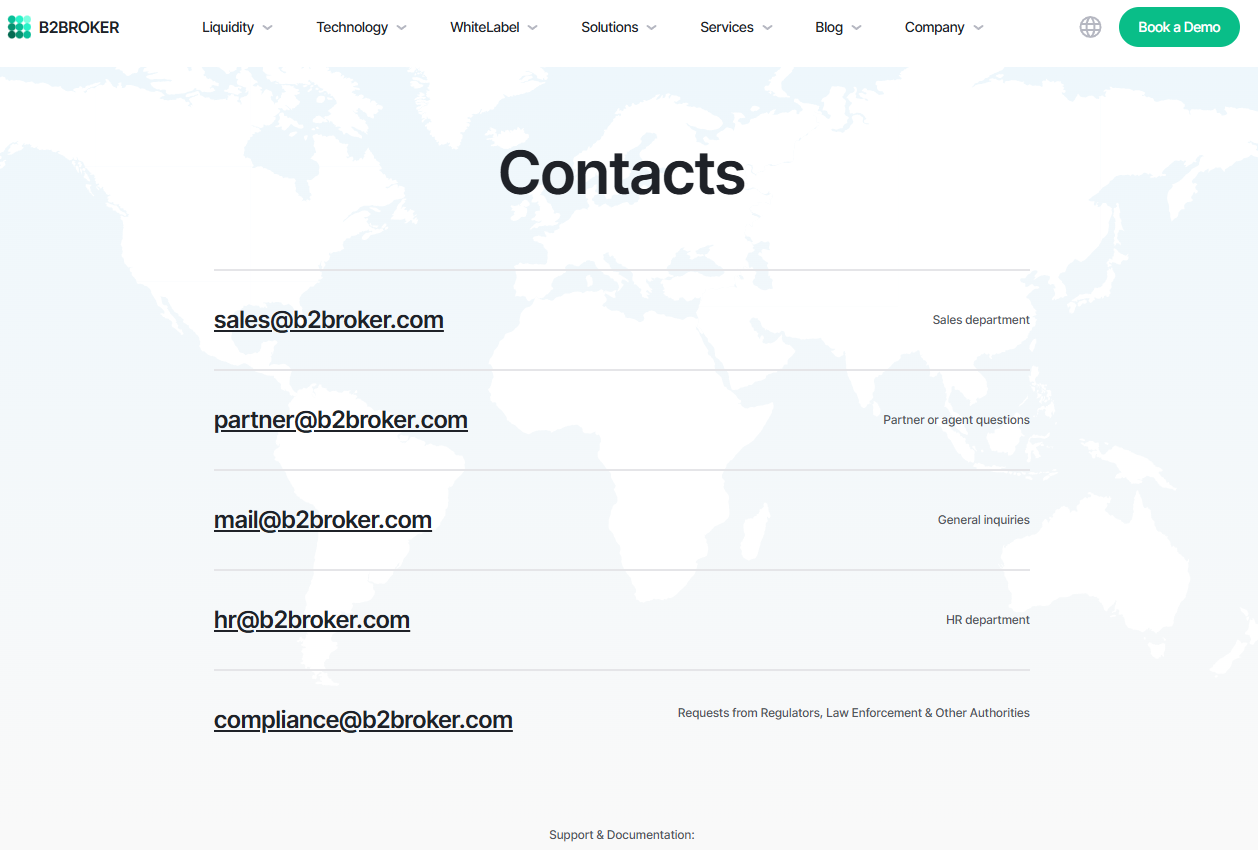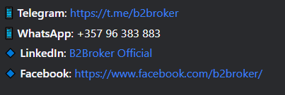 Также B2broker ведёт соцсети, среди которых: Facebook, LinkedIn, Telegram и WhatsApp, в которых есть телефон или личные сообщения для решения вопросов интеграции, технических программ или партнёрских услуг, программ.