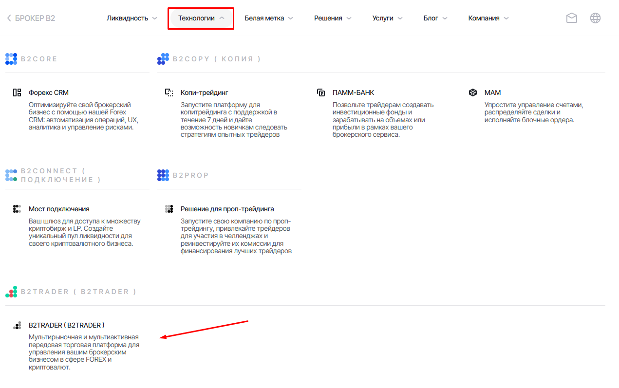 За трейдинг сферы «Б2» отвечает отделение B2 trader. В разделе «Технологии», что находится в шапке сайта можно найти подробную информацию про трейдинг.