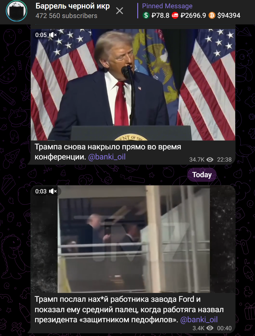 В Телеграм канале Баррель Черной Икры выходит около 35-40 постов в сутки, все они так или иначе связаны с экономикой, политикой и громкими процессами в мировом сообществе. Большая часть публикаций не являются авторскими, они заимствованы из открытых источников. Полезного для трейдеров крайне мало, в описании канала заявлено, что посты будут посвящены всему русскому, однако чаще всего можно встретить новости о Трампе и мировой политической ситуации.