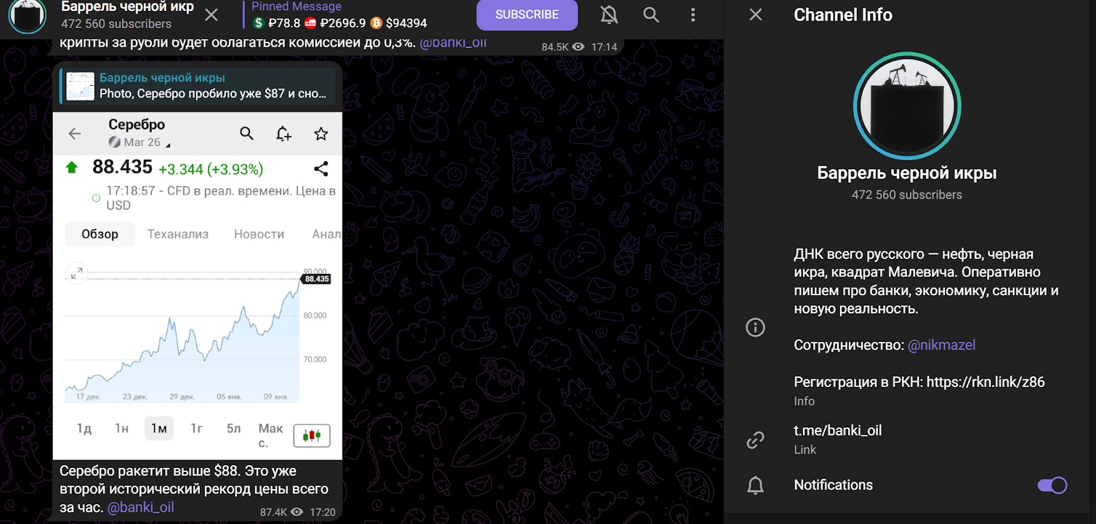 Нет точной информации о том, кто владелец Телеграмм канала Баррель Черной Икры, известно, что его зовут Никита, и больше ничего. Новостной проект собрал большую аудиторию, размещает перепосты из разных ресурсов и зарабатывает на рекламе. Платных услуг не имеет, отзывов о проекте нет. В статье расскажем, чем может быть полезен канал banki oil.