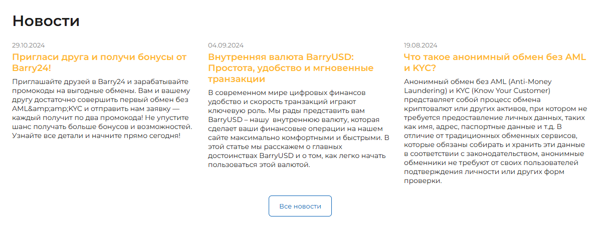 В обзоре мы детально разобрали деятельность проекта, изучили услуги и условия их использования, рассмотрели юридический статус площадки, а также проверили отзывы и выяснили, безопасно ли сотрудничать с обменником, скам ли Barry24 com и какие риски могут ждать юзеров при сотрудничестве