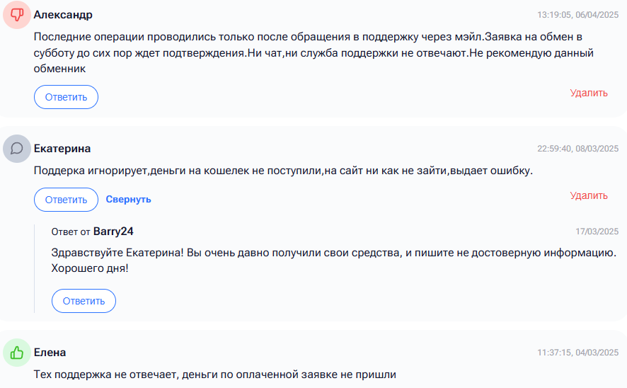 - отзывы о проекте Barry 24 в основном негативные. Это указывает на соответствующий характер репутации. Юзеры недовольны работой обменника и пишут недовольные комментарии о его деятельности.
