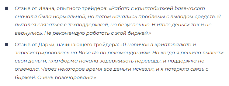 В Сети мало отзывов о Base Ro, однако, нам все же удалось найти несколько мнений о платформе от бывших клиентов. Большинство из них рассказывают, что стали жертвами мошенничества и не смогли вывести с биржи деньги, которые заводили туда для торговли.