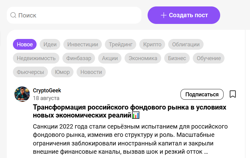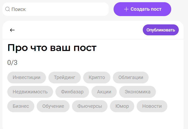 Для публикации поста достаточно нажать на соответствующую кнопку, ввести заголовок и написать текст. Можно добавить изображения, после чего нажать на кнопку «Далее». Автору предложат выбрать тему, а если нажать на «Опубликовать пост», он сразу появится на странице «Фин Базар Инвестиции».