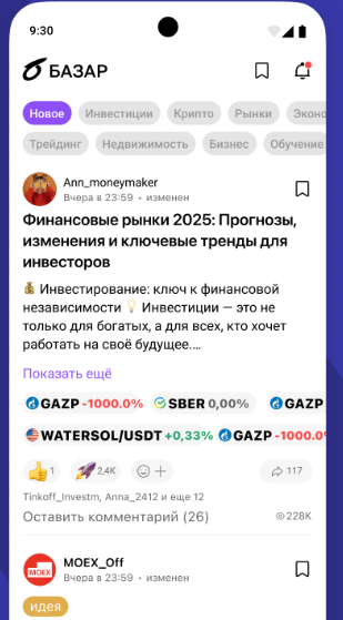 Каждому участнику предлагают заполнить профиль, указав свои интересы, специализацию и опыт. Это помогает найти единомышленников и даже деловых партнеров. Пользователи могут вести свой блог, делится идеями, обзорами и прогнозами по инвестициям. На странице bazar analytics выкладывают общую информацию о рынке. Есть группы по интересам, например, фондовый рынок, недвижимость, личные финансы, криптовалюты.