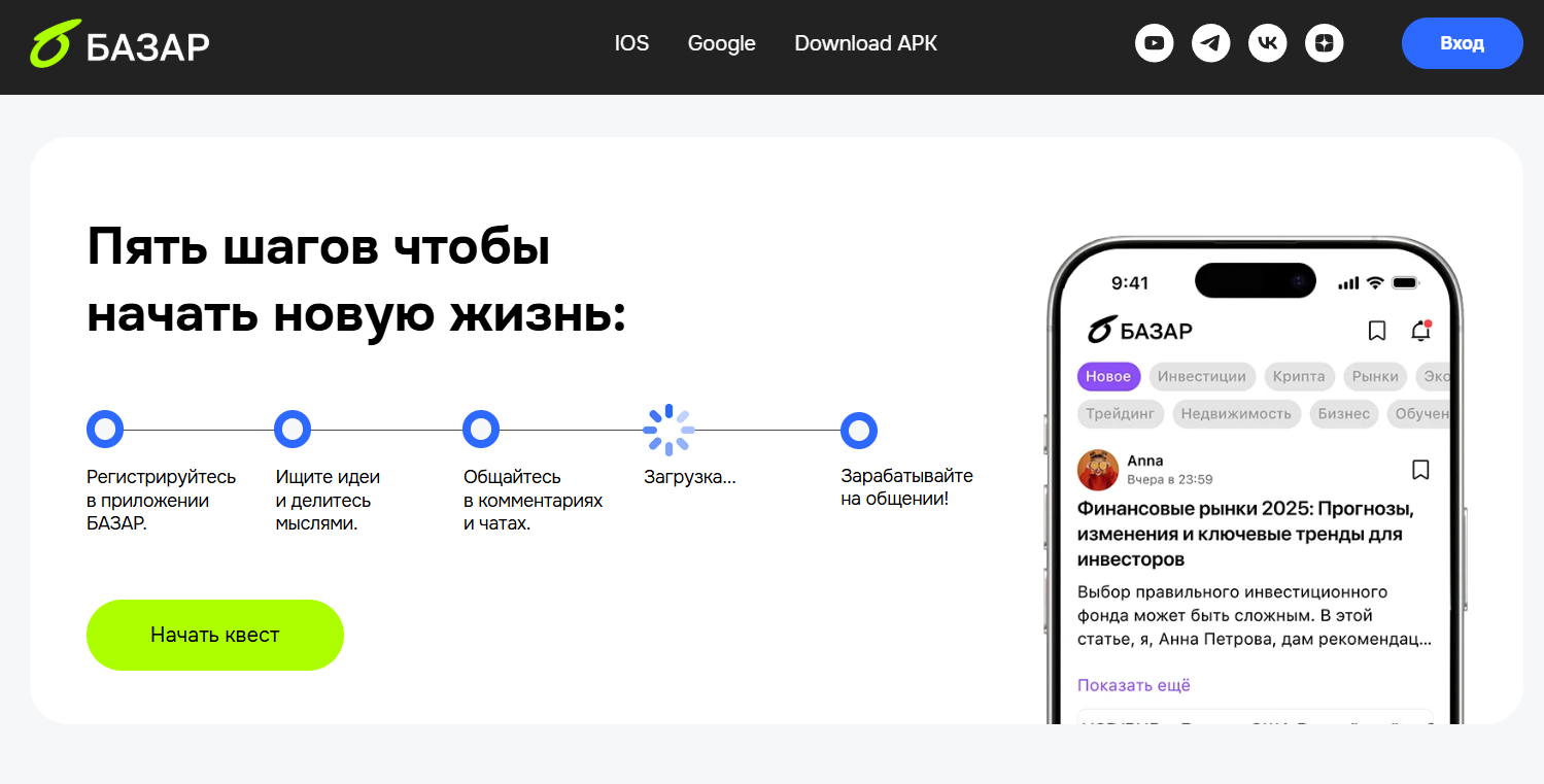 «Базар» — это финансовая социальная сеть, которую можно найти в интернете по адресу beta finbazar ru. Здесь пользователи общаются, обучаются и делятся опытом в сфере инвестиций и трейдинга. Главное отличие от других платформ в том, что на платформе отсутствует развлекательный контент. Действительно ли площадка поможет разобраться в личных финансах и научит зарабатывать, предстоит выяснить.