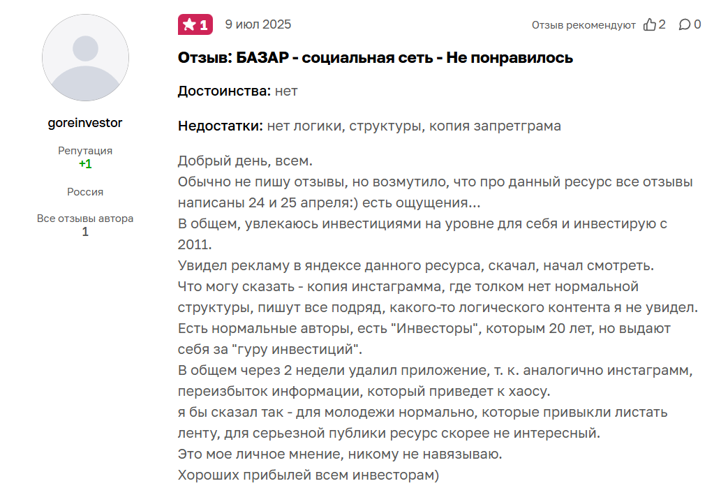Подозрения вызывает тот факт, что многие положительные комментарии написаны в конце апреля 2025 года. Это может говорить о том, что такие сообщения фейковые. Отрицательных отзывов о социальной сети «Базар» меньше, но в них пишут, что площадка похожа на Инстаграм, где среди горы мусора замучаешься выбирать действительно полезный контент.