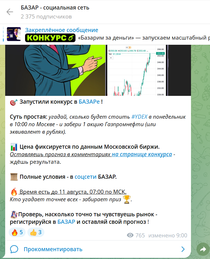 В сообществе во ВКонтакте «Bazar Инвестиции» менее 900 подписчиков, посты выходят не каждый день, хотя иногда их выкладывают сразу несколько. Лайки ставят редко, на большинстве публикаций их вообще нет. В Телеграме аудитория побольше — почти 2400 пользователей. Здесь контент обновляется чаще, пишут в основном общие советы по финансам. Посты набирают в среднем 700 просмотров и 10 реакций, но комментариев почти нет.