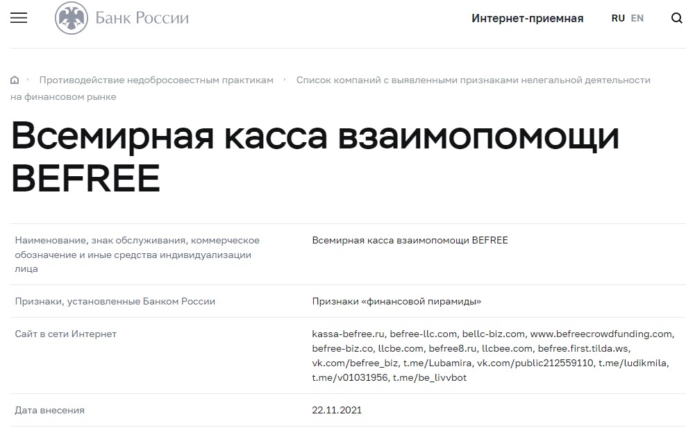 По всему устройству проекта видно, что BeFree — финансовая пирамида. Не имеет никаких источников дохода, кроме пополнений самих клиентов и их рефералов. Не имеет отношения к финансам и прочему, а суть проекта сводится к тому, чтобы перекладывать деньги из одного кармана в другой. За такую работу он уже попал в черный список Банка России, который назвал BeFree_LLC пирамидой.