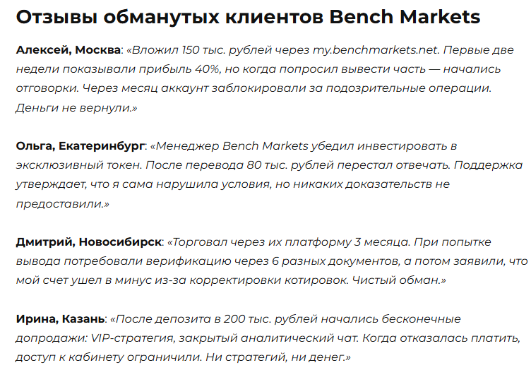 На основе отзывов о Bench Markets прослеживается типичная схема работы: после внесения депозита клиенты видят фейковый рост прибыли, но при выводе средств сталкиваются с непреодолимыми препятствиями.