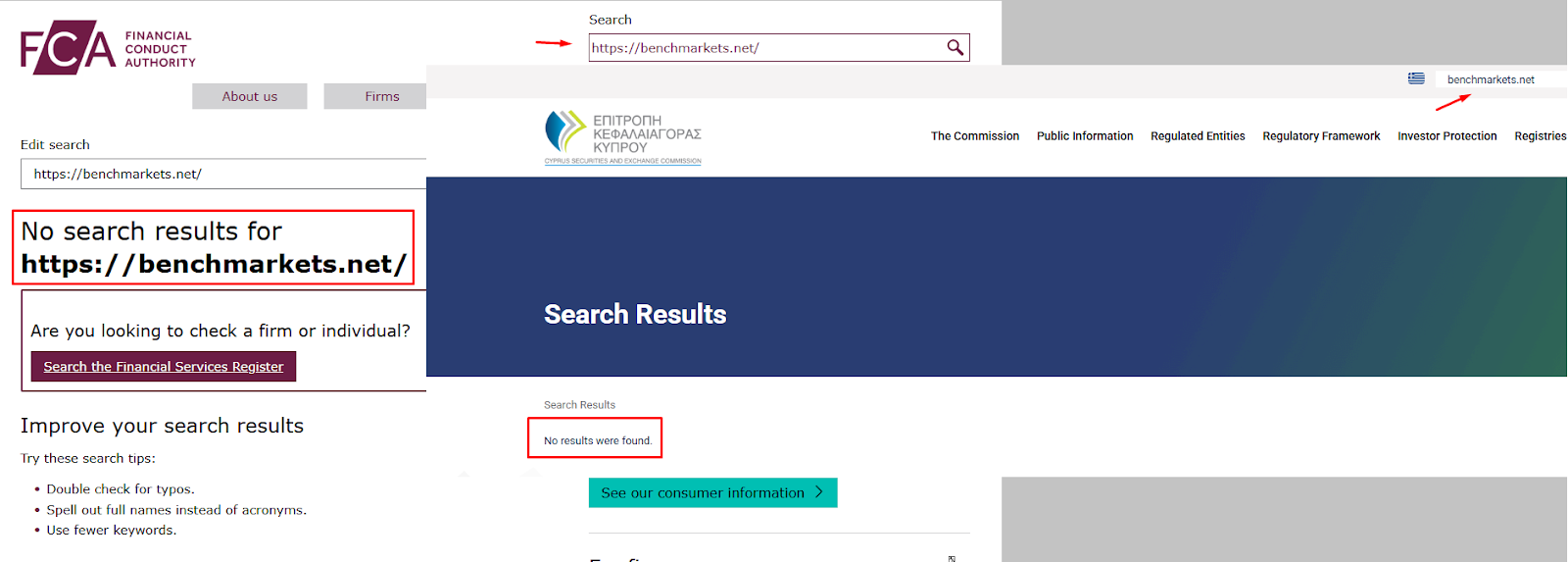 На сайте-терминале my benchmarkets net была указана лицензия от FCA, в то время пока на основном уточнялась гарантия от CySEC. Мы проверили наличие обеих лицензий, зайдя на сайты регуляторов.