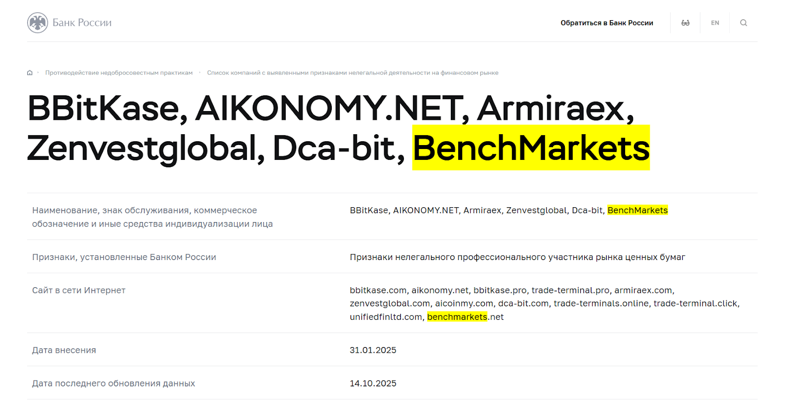Мы столкнулись с множественными статьями про BenchMarkets у ЦБ РФ и РосКомНадзора.