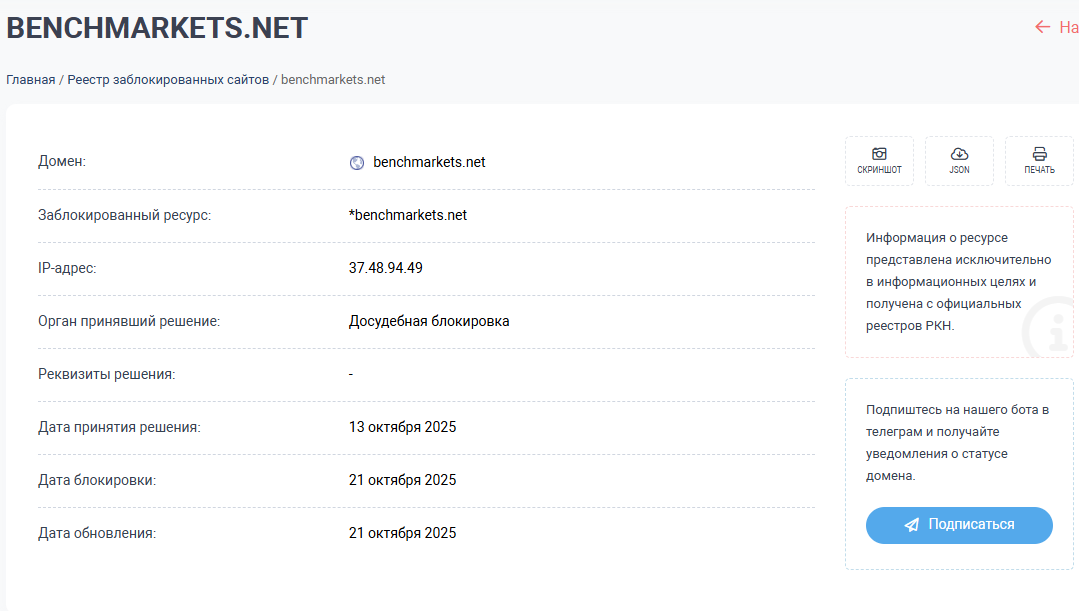 Что касается РКН, то этот орган также имеет небольшую статью касательно биржевика. Досудебная блокировка вступила в силу с 21 октября 2025 года, причина не уточняется.