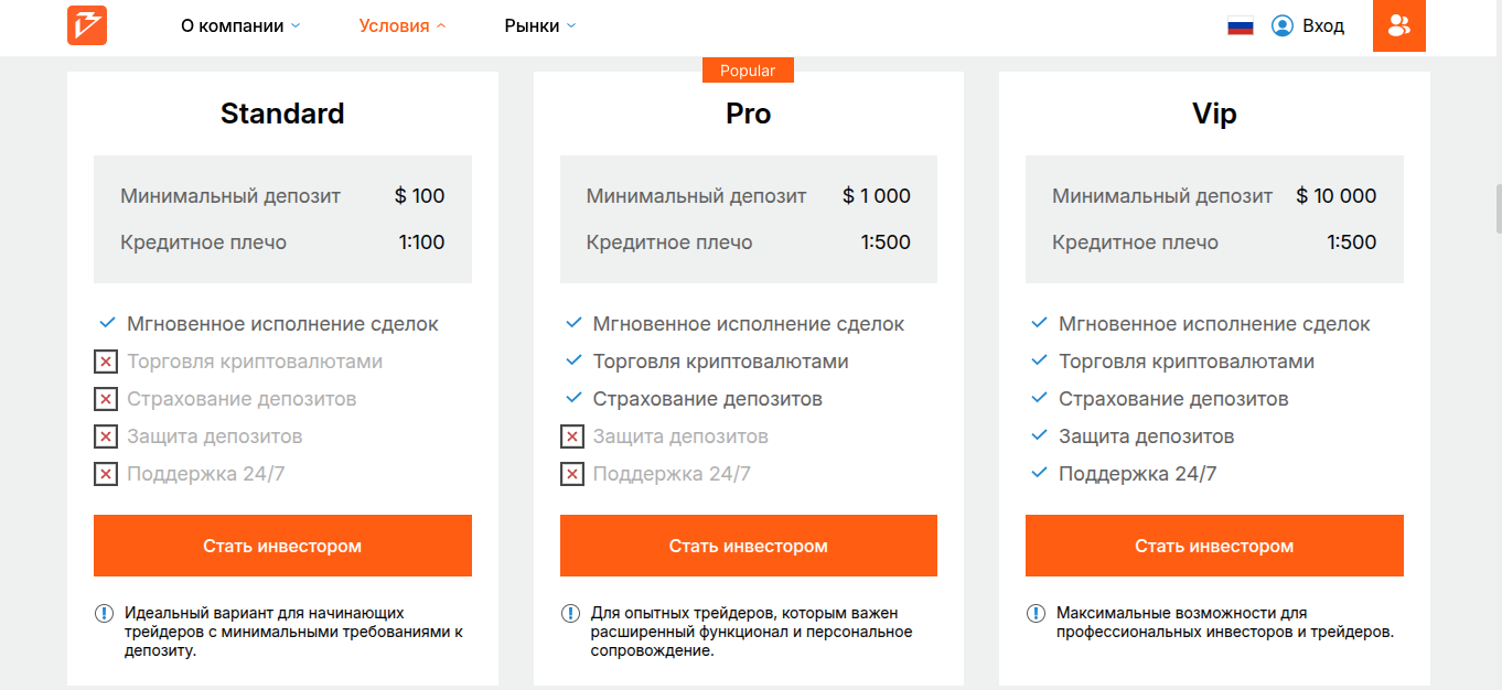 - Pro. Пополнять счет надо на сумму от 1000 долларов. Доступны кредитное плечо к 1 к 500, торговля криптовалютами и страхование депозитов.