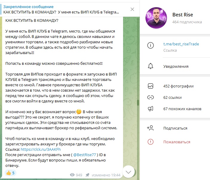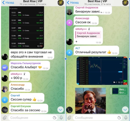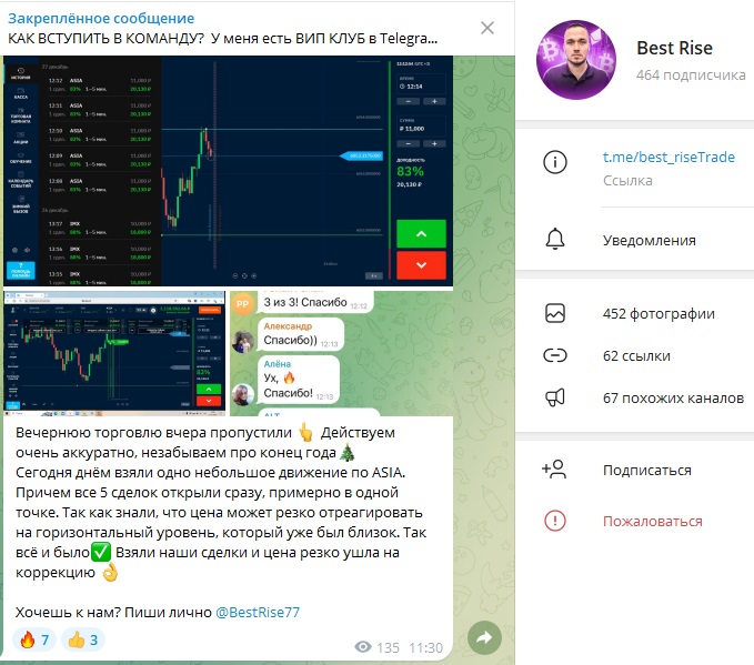BestRise — блог в Telegram для заработка на бинарных опционах. Его владелец BestRise77 предлагает готовые сигналы для работы на платформе Бинариум и гарантирует их высокую проходимость. Подобный заработок очень рисковый, поэтому мы решили проверить деятельность проекта Best Rise Trading.