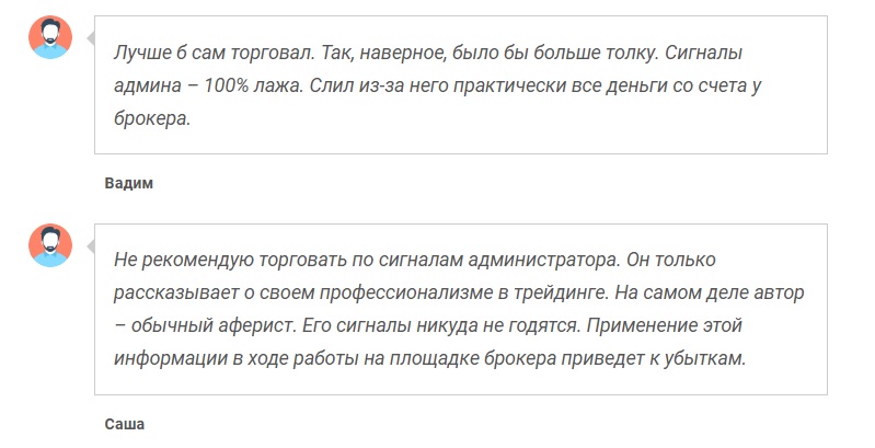Эта информация подтверждается реальными отзывами экс-клиентов. В них трейдеры жалуются на низкую проходимость сигналов и, как результат, слив депозита.