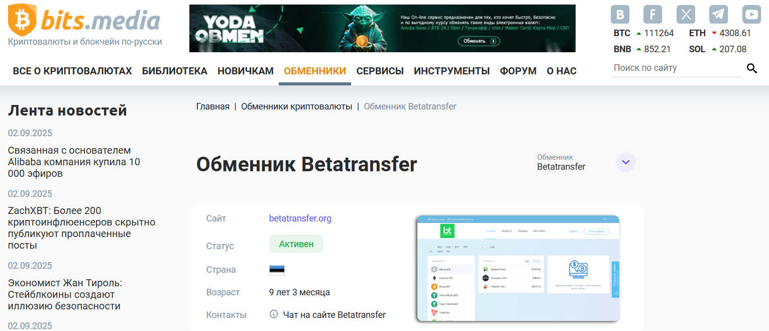 Обменник «БетаТрансфер» присутствует на нескольких мониторингах, среди которых BestChange, Kursoff, WellCrypto и другие, а также в рейтингах Bits media и BitcoinTalk org, что добавляет ему доверия.