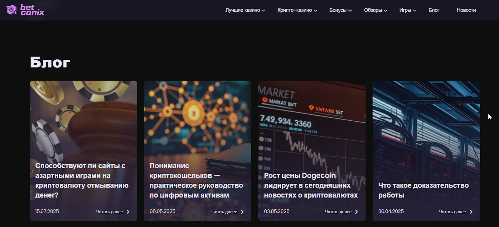 Есть блок с новостями, но посты публикуются с нерегулярной периодичностью – в месяц может выйти по 4 статьи, а после обновлений BetConix придётся ждать несколько месяцев. Последний пост на тему «Способствуют ли сайты с азартными играми на криптовалюту отмыванию денег?» опубликован 15.07.2025.