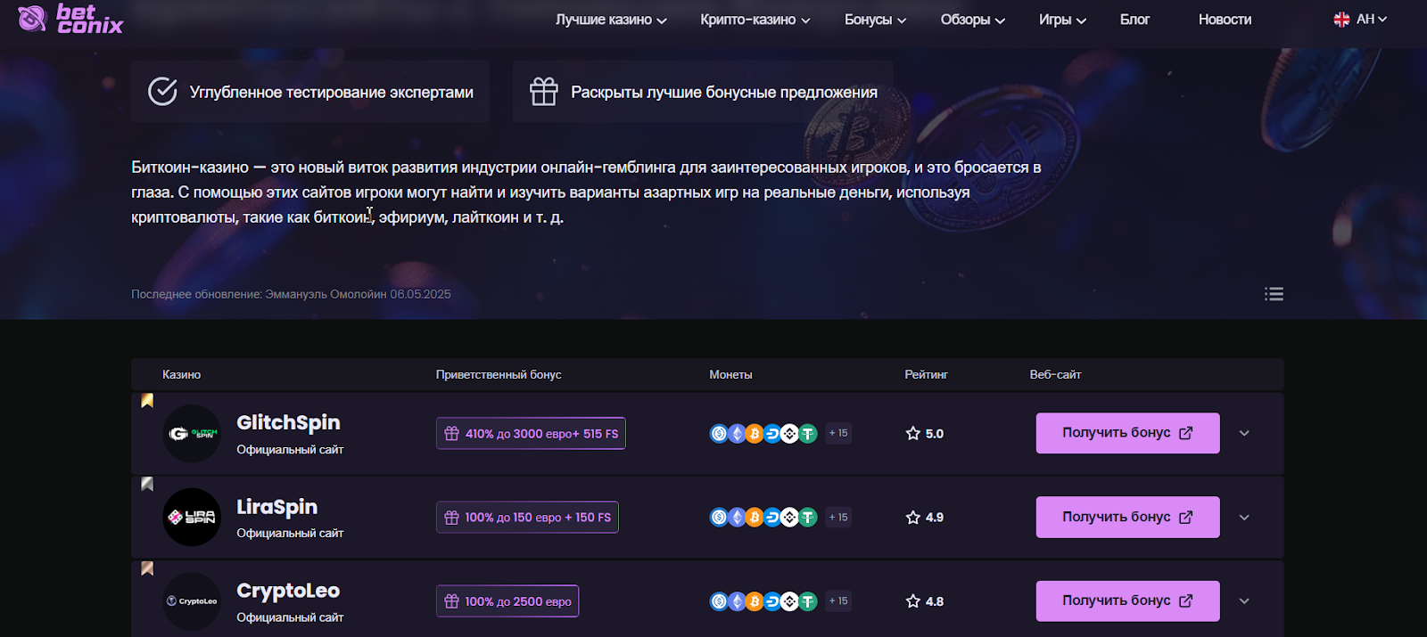 BetConix – это биржа, которая раньше предлагала торговлю критовалютой, но недавно объявила о перезапуске проекта. На июль 2025 года здесь можно найти информацию по лучшим биткоин-казино 2025 года – криптосайты с топовыми бонусами. Сайт работает на нескольких языках, но в настройках отсутствует русский, что соответствующим образом осложняет процесс знакомства с площадкой для русскоязычной аудитории.