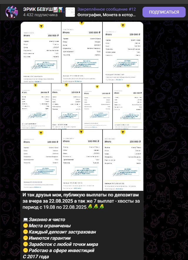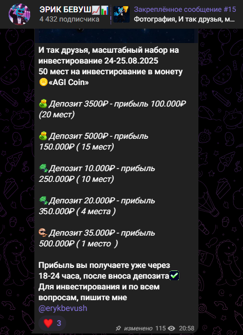 В закрепленных постах по большей части приглашение к сотрудничеству. Один из последних на август 2025 года – инвестирование в монету AGI Coin. Всего набор ведется на 50 мест. С депозитом на ₽3,500 ожидаемая прибыль должна составить ₽100,000. На эту позицию трейдер Эрик Бевуш предоставляет 20 мест. Автор обещает доход уже через 18-24 часа после начала сотрудничества. Для старта необходимо обратиться к автору в личные сообщения. Стоимость услуги неизвестна, если она, конечно, не подразумевается как бесплатная.