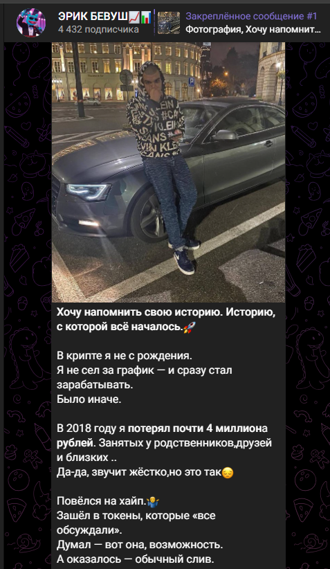 Эрик Бевуш позиционирует себя опытным и известным игроком современного финансового рынка. Он называет себя экспертом в области криптовалютных инвестиций. В шапке личного профиля ErykBevush админ указывает, что является основателем известного проекта «За гранью богатства», а его стаж превышает 9 лет на август 2025 года. В обзоре проанализируем, является ли на самом деле трейдер известным, и какие методы торговли предлагает для заработка на биржах.